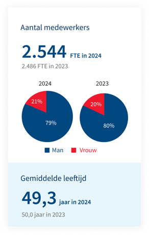 In 2024 versterkten we ons personeelsbestand met 613 nieuwe collega’s, een verdubbeling ten opzichte van het aantal nieuwe medewerkers in 2023. Initiatieven zoals teken- en referralbonussen zorgden voor 30% meer sollicitanten. Een gerichte arbeidsmarktcampagne versnelde de volumewerving met 40%. Positieve CAO-afspraken en samenwerking met de gemeente Rotterdam verhoogden de instroom, vooral voor buschauffeurs. Waar we voorgaande jaren in fte’s krompen, stijgt het aantal van 2.471 (eind 2023) naar 2.652 fte ultimo 2024. De stijging zit met name in het aannemen van buschauffeurs die we voorheen inhuurden. We zetten onze inspanningen voort, want voor 2025 zijn we op zoek naar 750 nieuwe collega’s.
